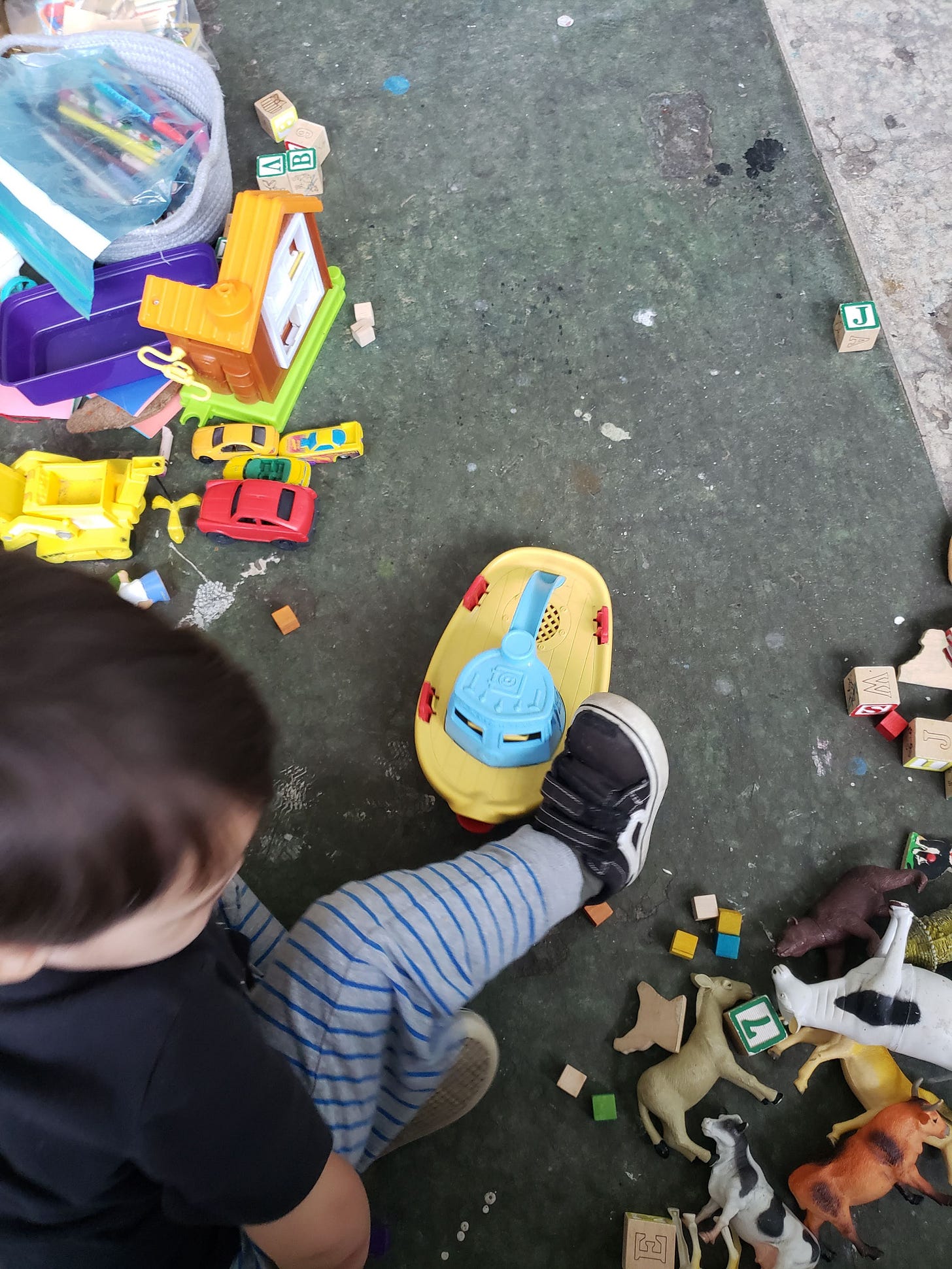 Sarah personally collected all the childcare resources that were on offer at the child-inclusive residency: a high chair, a baby bath, containers to hold bags of Ontario milk, a play kitchen for while you were making meals, and old toys and art supplies for the children’s studio.